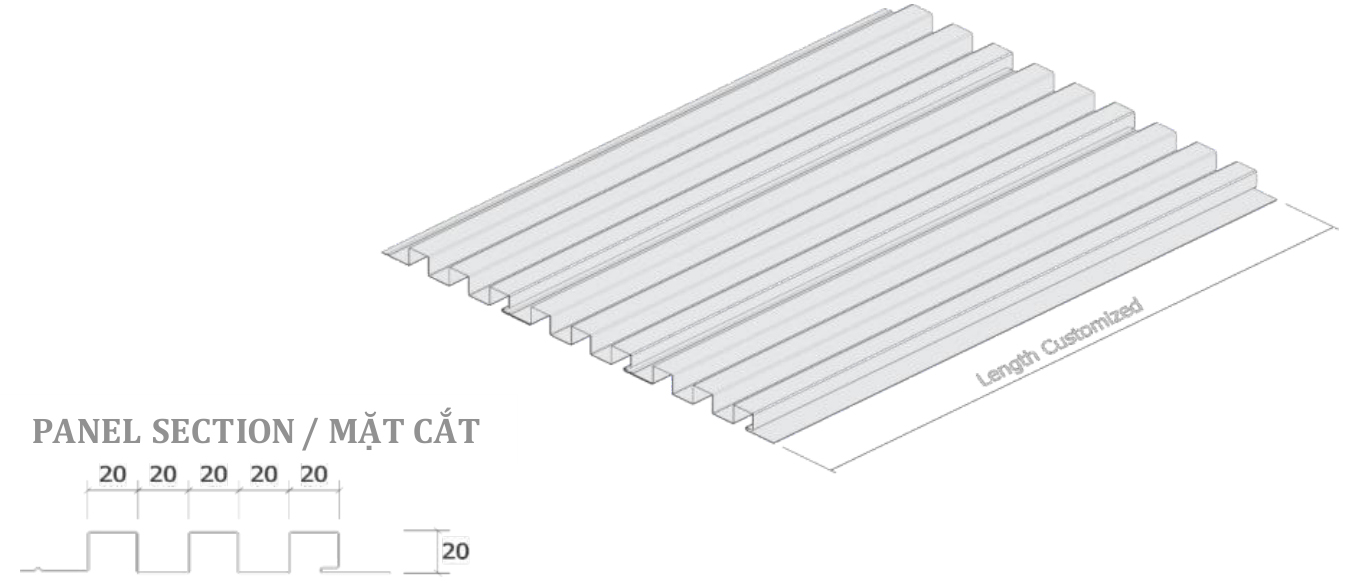 Hệ thống tấm ốp trần nhôm/tường nhôm F20-Shaped là tấm có dạng sóng với bề rộng 120mm, các sóng là 20-20-20 cao 15mm được liên kết với cùng hệ xương thép hộp hoặc khung trần thạch cao, cho phép sử dụng với độ uốn cong theo chiều dọc tấm. Các tấm ốp trần nhôm/tường nhôm F20-Shaped làm bằng nhôm phủ sơn gia nhiệt với ưu điểm bền, nhẹ và có thể tái sử dụng. Độ dài tấm nhôm sóng được sản xuất theo yêu cầu, tối đa 6000mm, có thể lắp phù hợp cho cả vị trí trong nhà và ngoài ban công, tấm ốp trần nhôm/tường nhôm F20-Shaped được thi công, tháo lắp dễ dàng bằng tay mà không cần đến thiết bị chuyên dụng. Các nẹp viền tiêu chuẩn được sử dụng làm đường bao, đảm bảo tính thẩm mỹ.